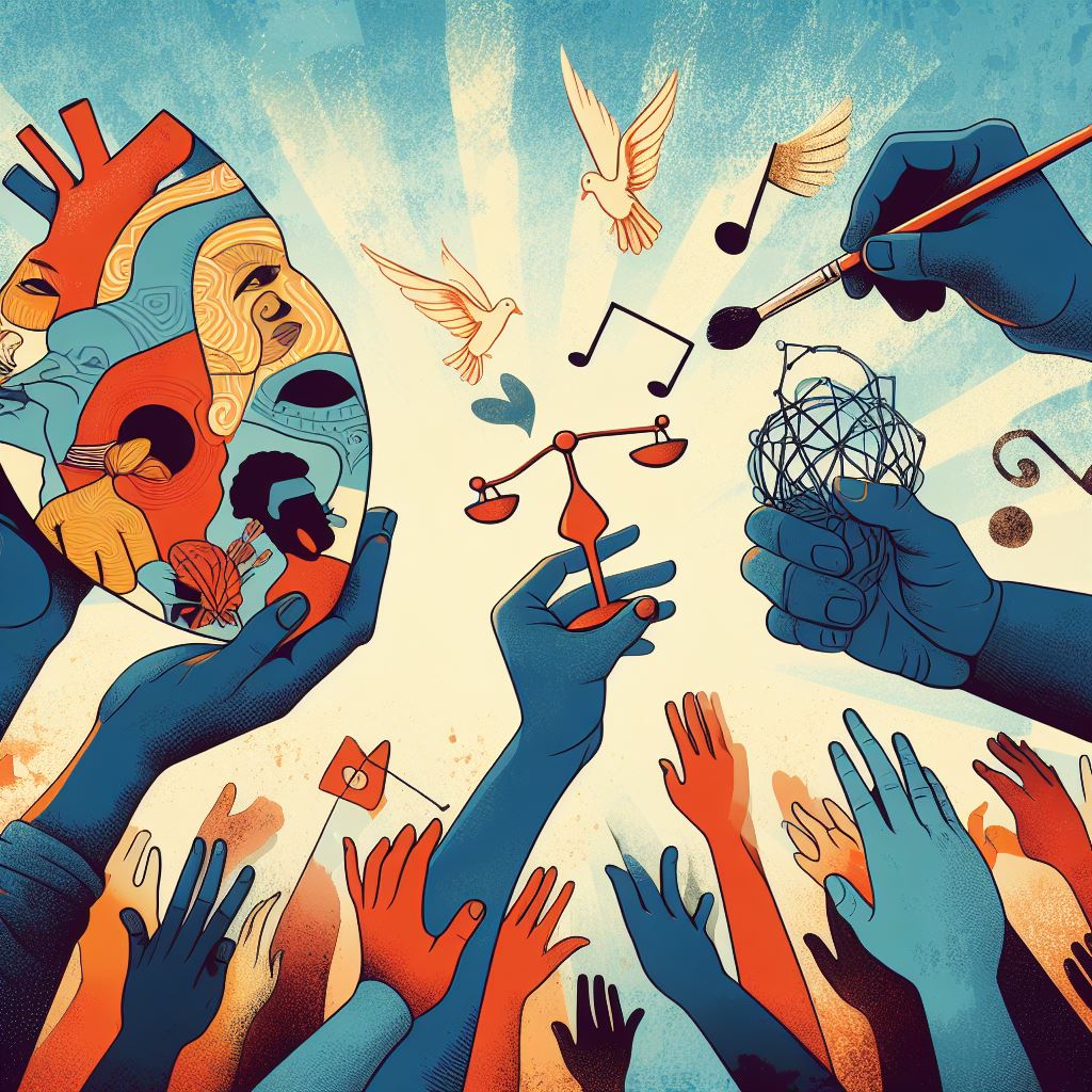 | Sanat, farkındalık yaratır. | Sanat, toplumda adalet duyarlılığını artırır. | Sanatçılar, insan haklarına dikkat çeker. |