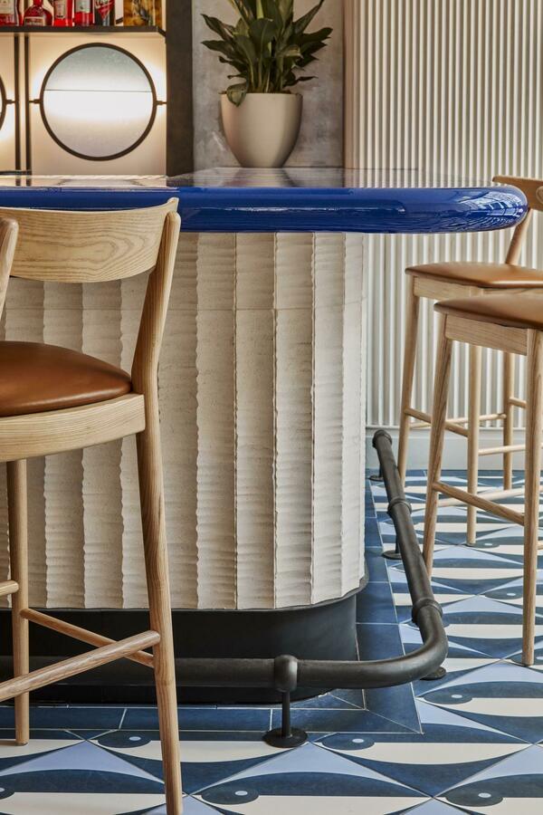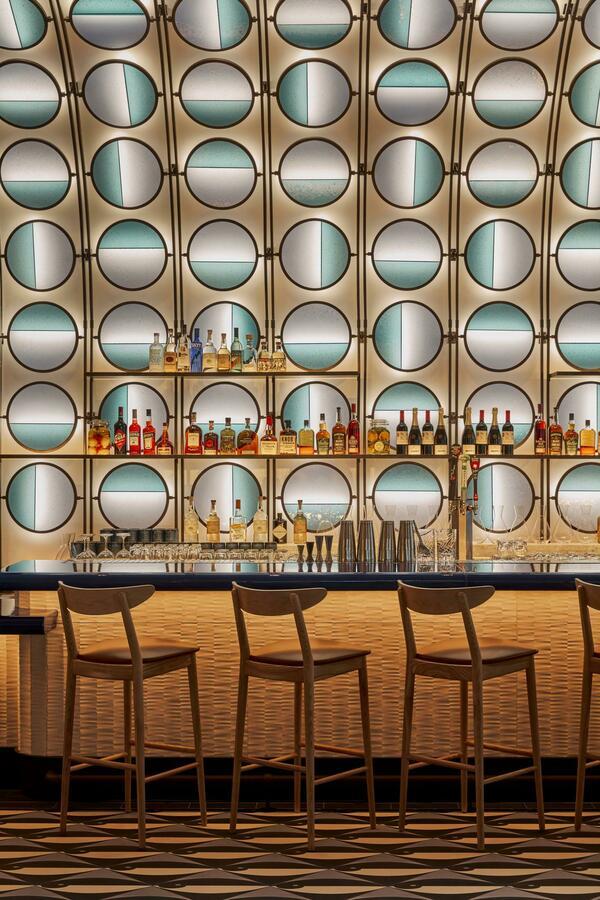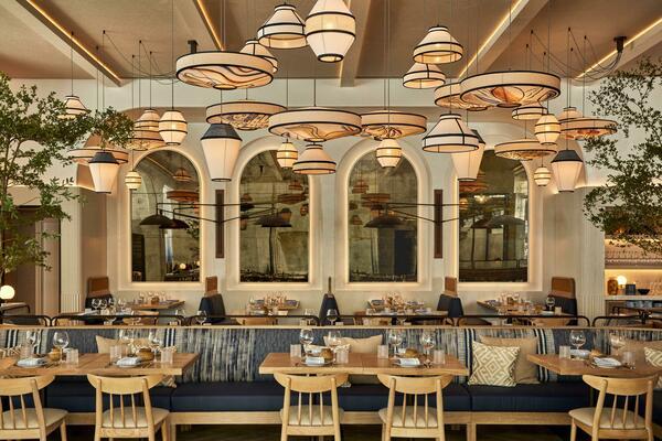 New York’ta Rockwell Group, sıcak bronz kaplamaları beyaz meşe ağacıyla harmanlayan sofistike, ancak tanıdık iç mekanlar yarattı. Mavinin vurguları, hafif ve nötr ortamı noktalıyor – Akdeniz’in masmavi sularına bir selam verirken, yumuşak kavisli mobilyalar, tüllü mavi ombre perdelik, keten akustik paneller ve şerit desenli ahşap zemine yerleştirilmiş mavi fayans şeritleri, tamamlayıcı bir çekici atmosfer yaratıyor.