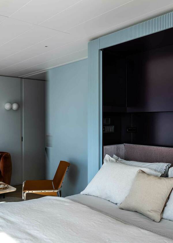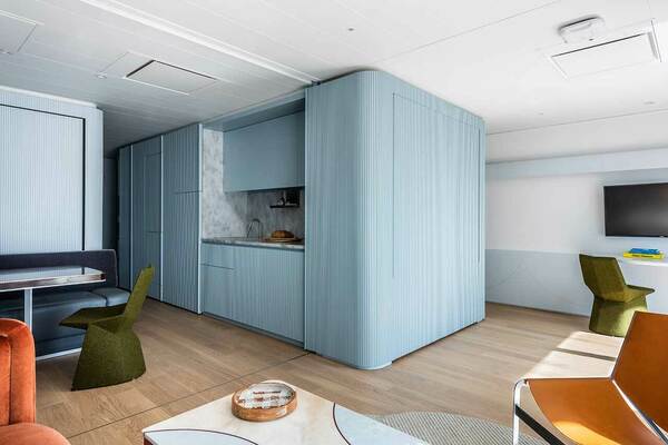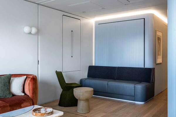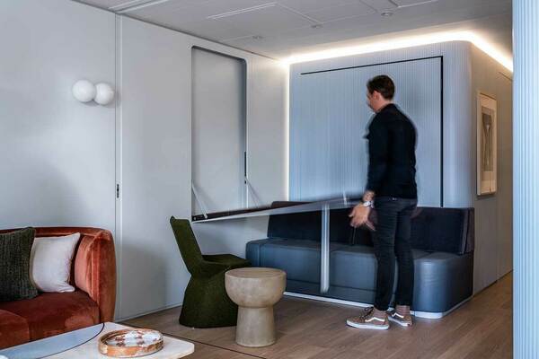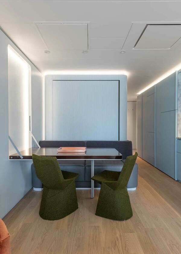 Gündüz yaşam ve yemek yemek masası alanları ile 4+ kişinin rahatça vakit geçirebileceği yaşan alanı masanın duvarlara gizlenmesi ve yien duvarlara gizlenmiş 2 adet 2 kişilik yatağın açılabilmesi sayesinde aynı anda 4 kişinin konaklayabileceği 2 ayrı yatak odasına dönüşüyor.