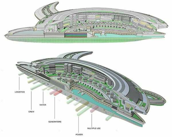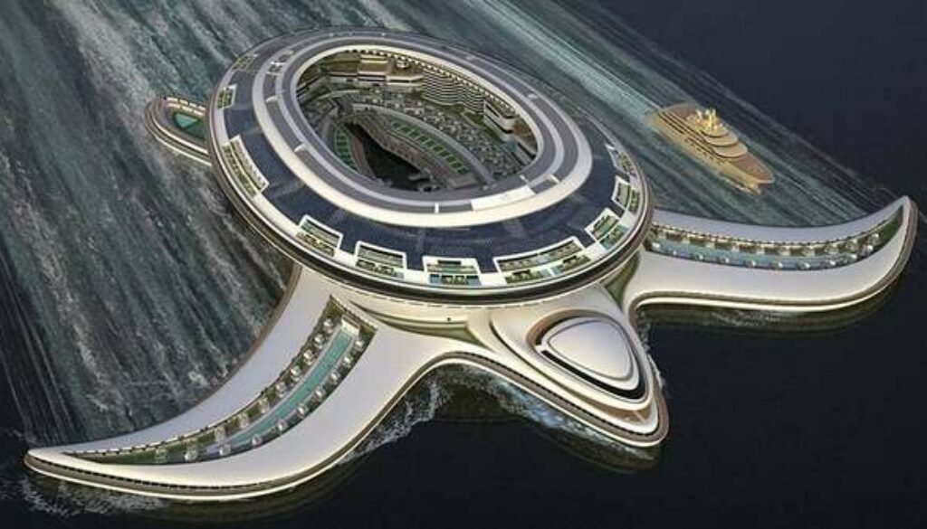 Sıradışı tasarımcı Pierpaolo Lazzarini, su kaplumbağası formunda “Pangeos” adlı devasa bir yüzen şehir tasarlamış. 500 metre uzunluğa 610 metre genişliğe sahip bu şehrin kapasitesi 60 bin kişi. İçerisinde otel, alışveriş merkezi, villalar, yat ve uçak garajları bulunuyor. Çatısında bulunan güneş panelleri sayesinde kendi enerjisinide üretebilmekte.